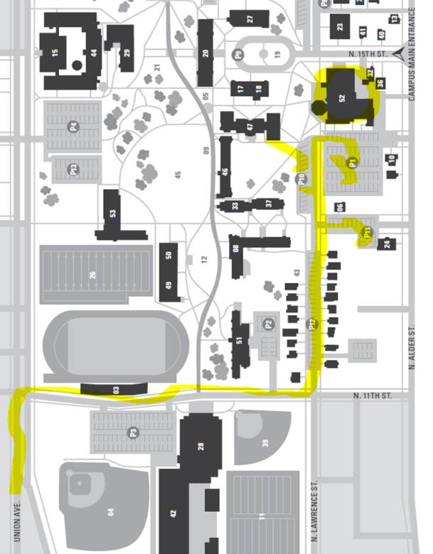 street—make a left and head toward the Parking Lots. P1, P10, P11.